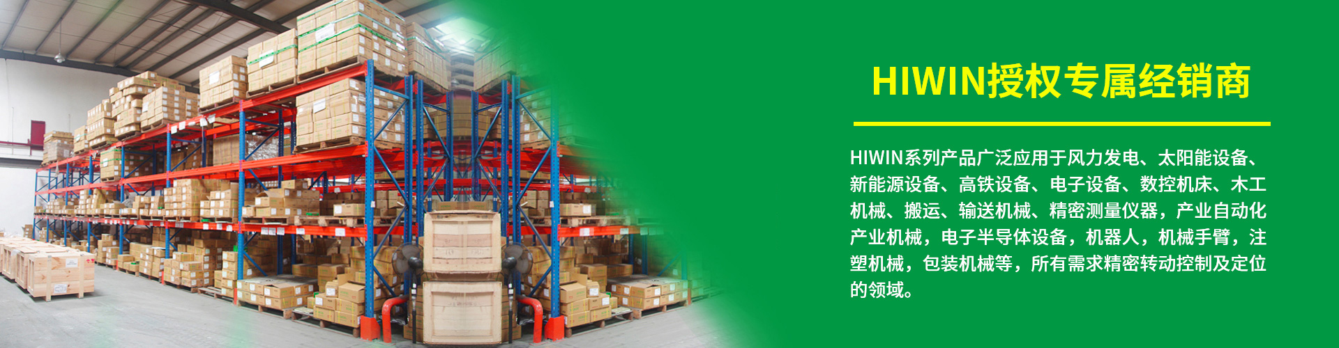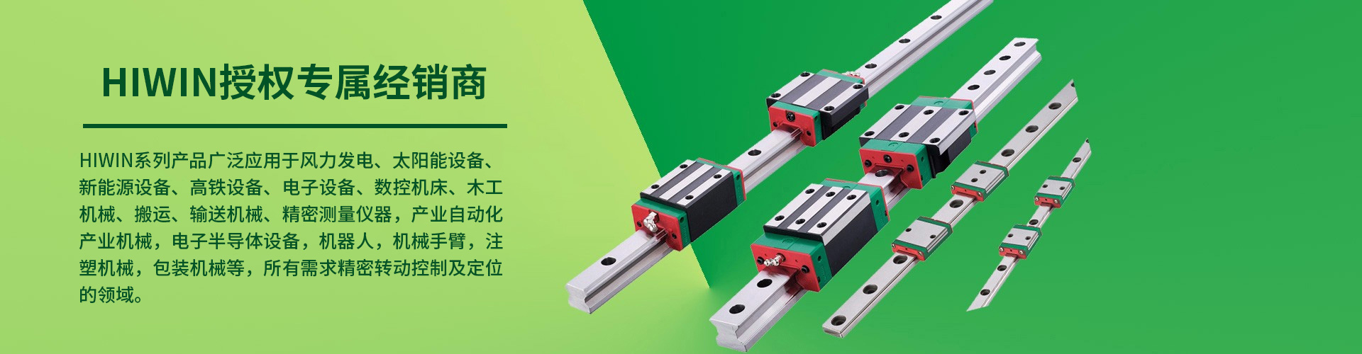 本司销售HIWIN的产品主要有滚珠丝杠、直线导轨、精密轴承、工业机器人、晶圆机器人、医疗机器人、线性马达、转矩马达、平面伺服马达、位置量测器、驱动器、定位平台、线性致动器及 AC 伺服马达等,广泛应用于生技医疗、半导体、光电产业、智能自动化、环保节能产业、精密机床、交通运输等精密工业与高科技产业。
